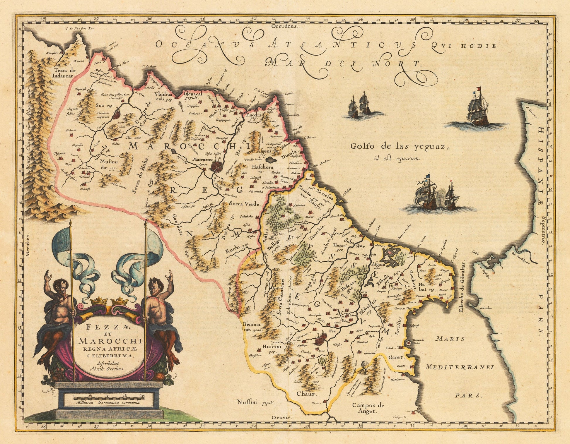 This comprehensive map of Morocco orients to the west and shows the area in lavish detail from the Atlas Mountains in the south to the southern coast of Spain, whom controlled portions of this area from 1580 until 1640 along the coast at Ceuta, Tangiers, and Arzilla. Engraved in Blaeu¡¯s traditional style, mountains, forests, and river systems fill the empty spaces. Several towns are mapped with Taradante, Fez, and Marakesh highlighted in red.