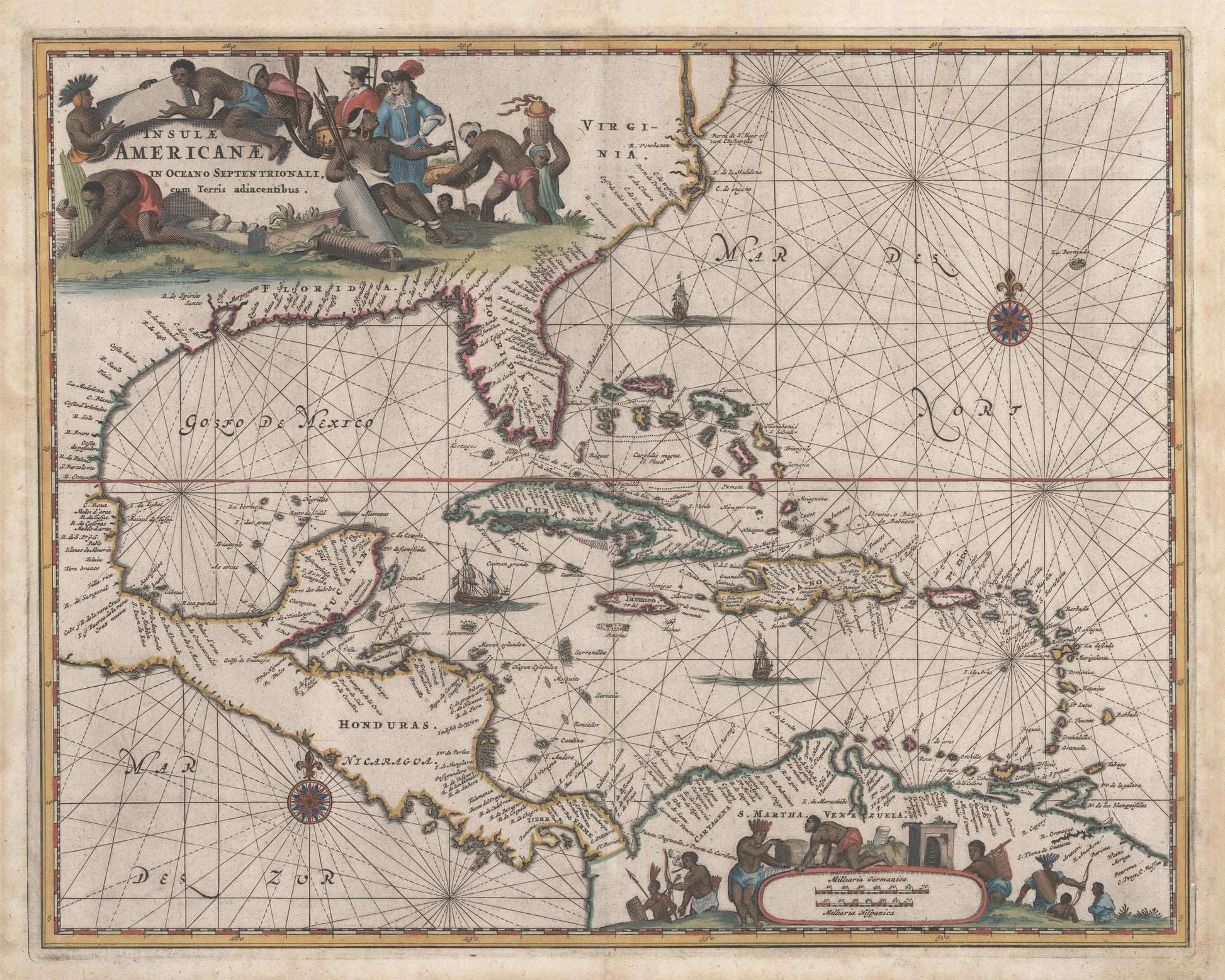 The map displays numerous sea ports and towns from Virginia in the north to Mexico Honduras the northern coast of South America and all the islands in between.?Florida is depicted in a form consistent with early Dutch Sea Charts and the southeast coastline of America protrudes too far east. Coastal cities and ports are noted with Spanish, Portuguese, and English nomenclature.