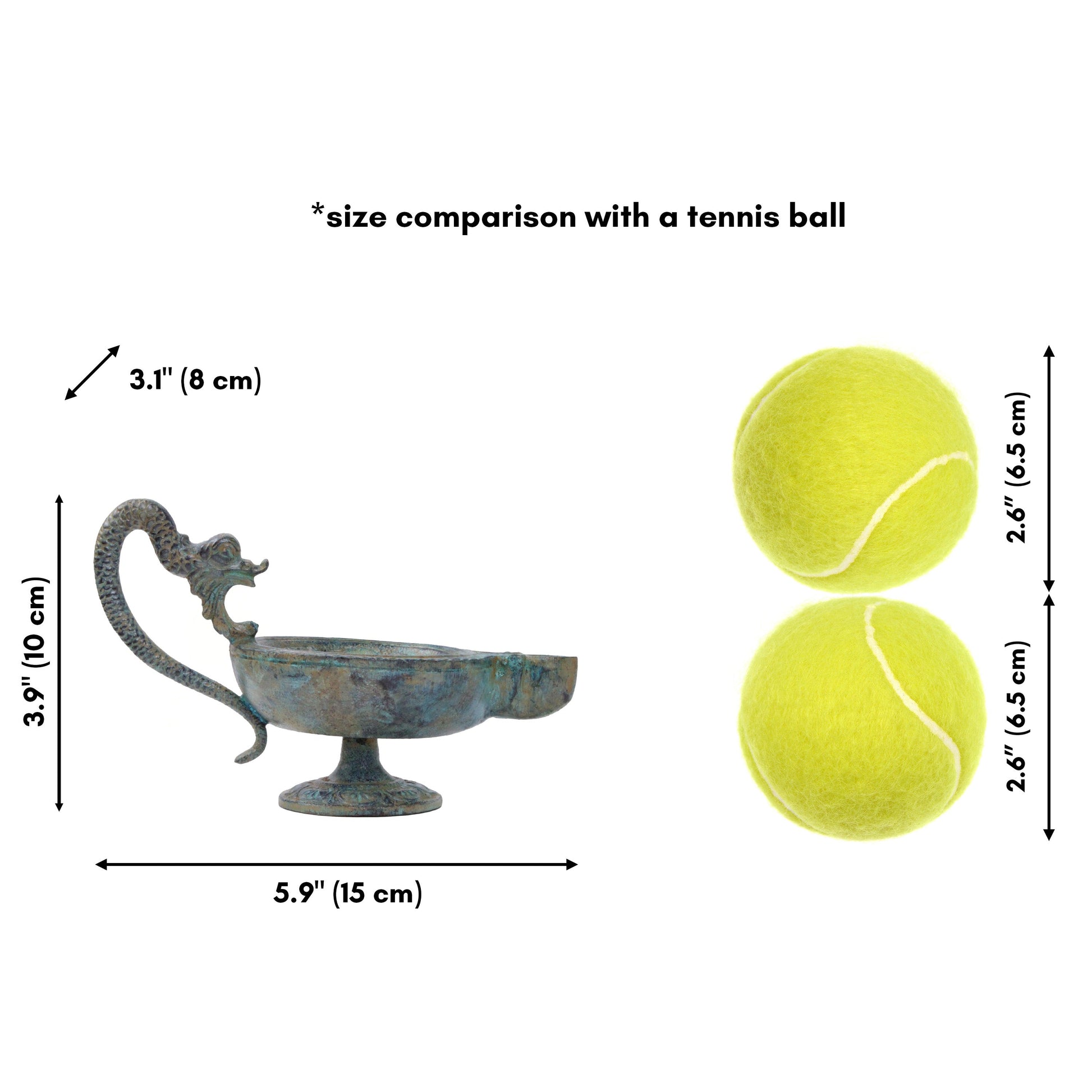 An impressive reproduction of a large Bronze Roman Oil Lamp with one unique noozle, a fish style handle, tall foot, and detailed relief of Nike, the goddess personification of victory. A seal can be read with latin inscriptions: Annum Novum Faustum Felicem. This type of oil lamp was traditionally given as a good wish for New Year¡¯s Day by the Romans and there are many similar findings on diplay in many museums in the world, including a 100 AD finding in the British Museum.