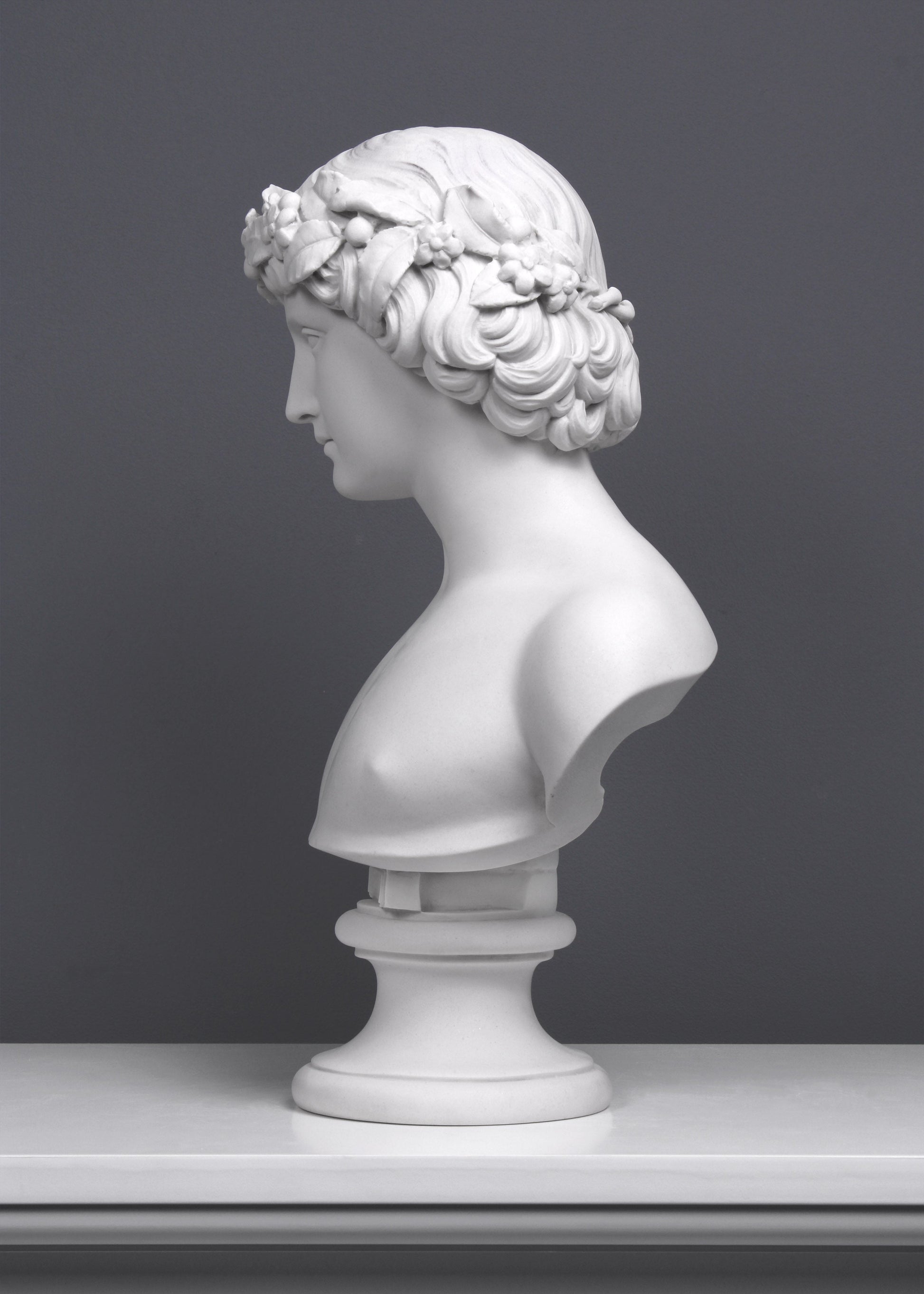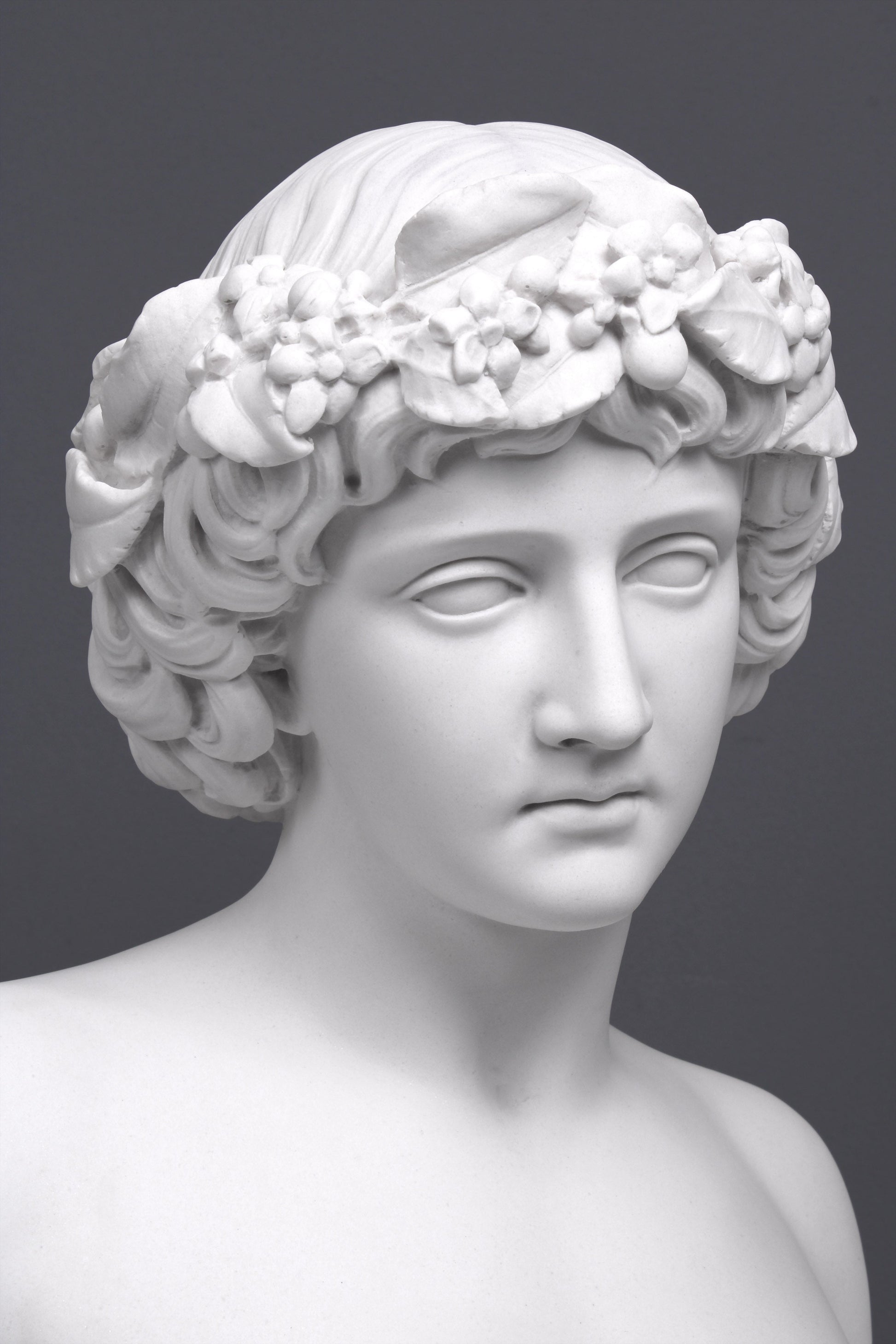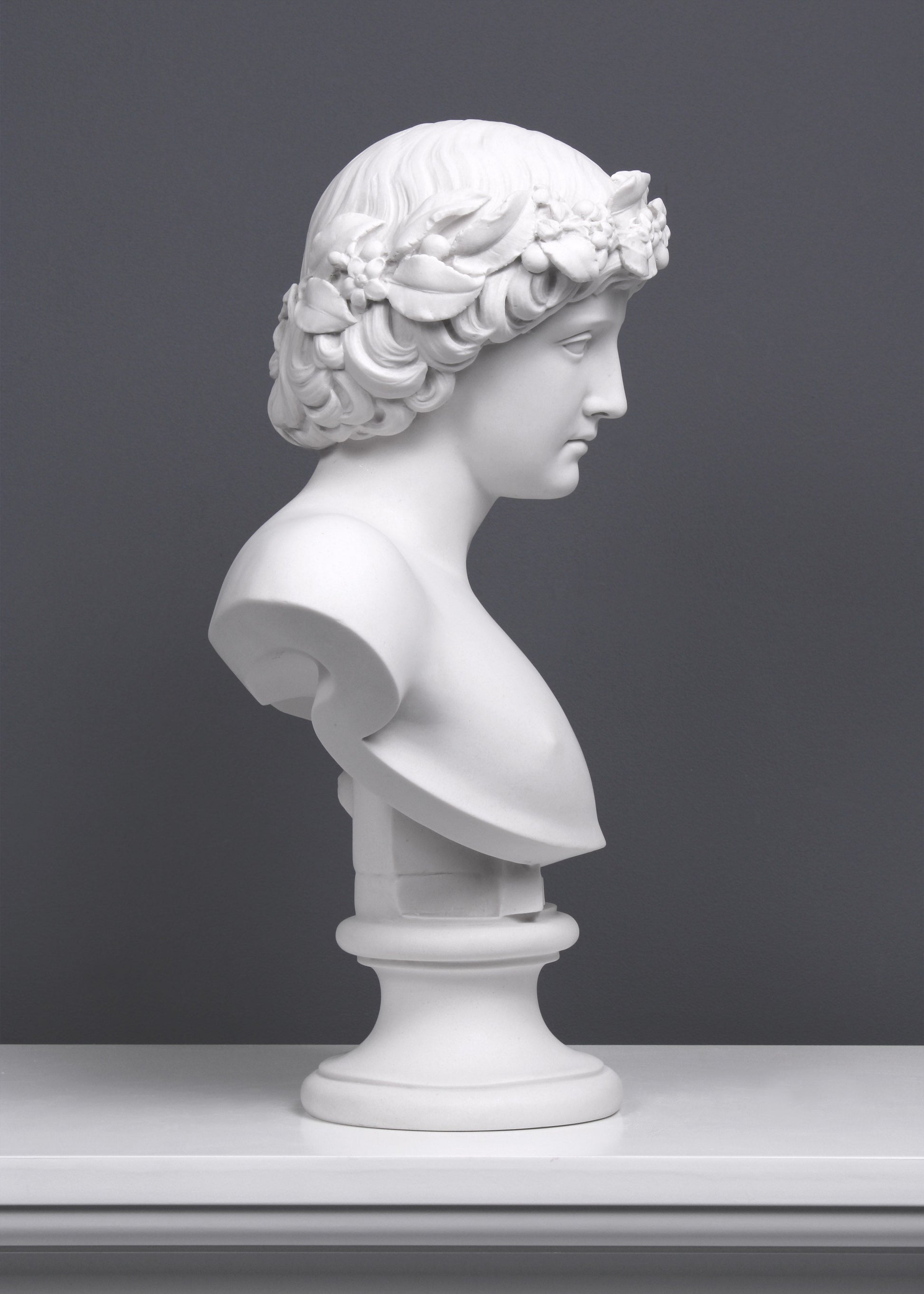 A romantic Italian sculpture of the handsome Antinous, God of wine, entertainment and all things good, adorned with a Bacchus wreath of vine leaves around his head.